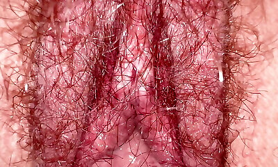 gros plan macro buisson velu avec creampie dégoulinant, femme milf amateur sur une sextape maison avec le plus beau buisson velu