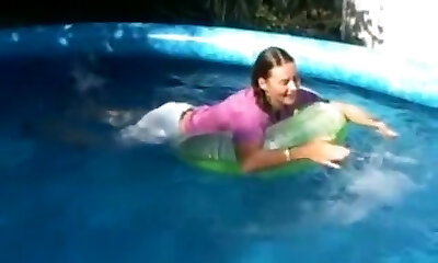 Lovely teen in stockings rides a thick and edible cock inside her muff at the pool