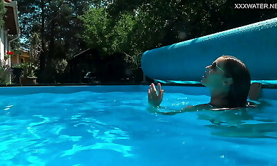 Busty brunette ultra-cutie plays with her big lush tits and shaved vagina by the pool