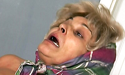 возбужденная белокурая бабуля получает жесткий удар по своей бритой киске