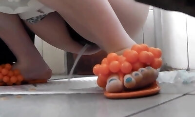 Chunky white slut climbs on a shitter to piss and gets filmed on cam